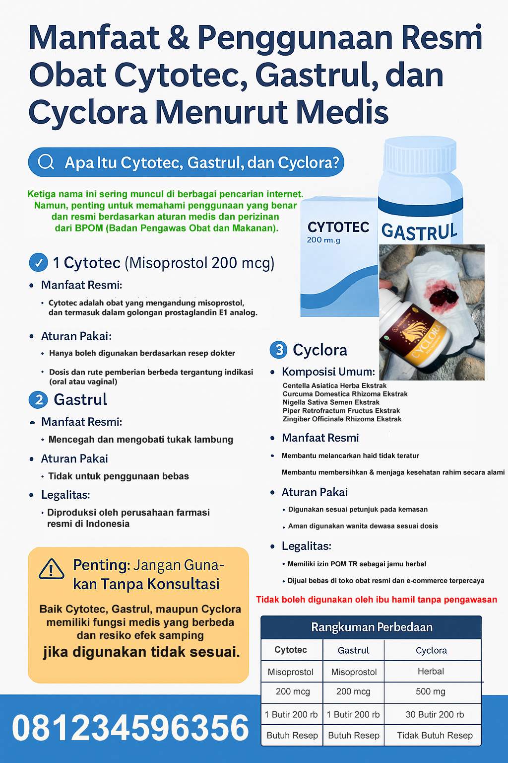 Di website atau apotek online kami sudah terpercaya di google Anda bisa mendapatkan obat aborsi, Cyclora pembersih dan pendorong Janin dengan kepastian gugur 100% Berhasil, bukan hanya sekedar php. Dijamin bersih tanpa harus kuret lagi ke dokkter dan aman karena dibimbing langsung oleh kami.